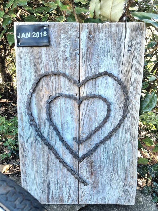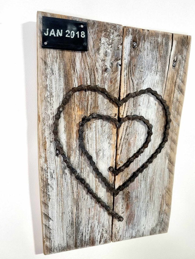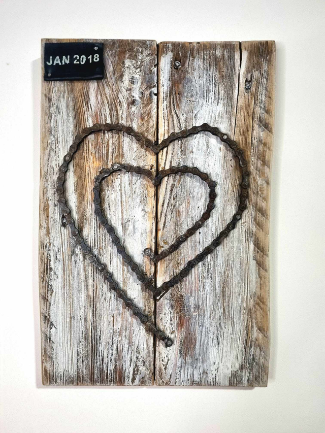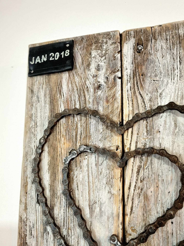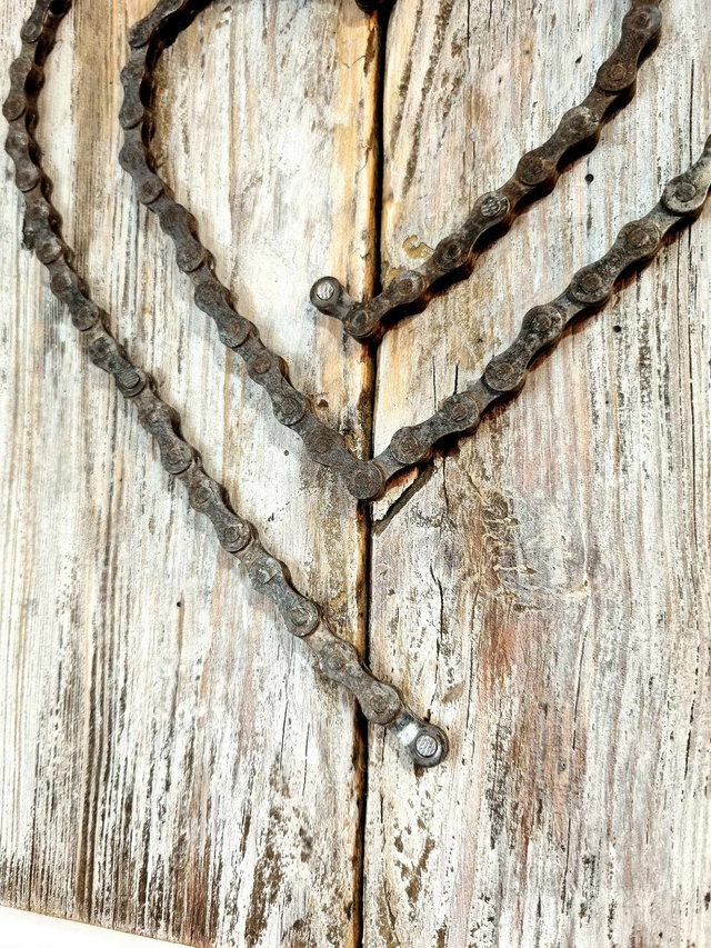 Élément Central en Chaîne de Vélo : Le cœur central est formé à partir d’une vieille chaîne de vélo, ajoutant une touche industrielle.