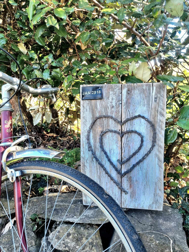 Œuvre d’art recyclée en chaîne de vélo et chambre à air sur bois de palette