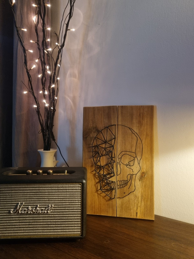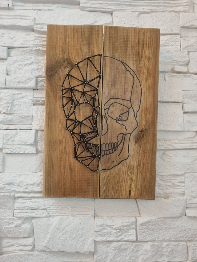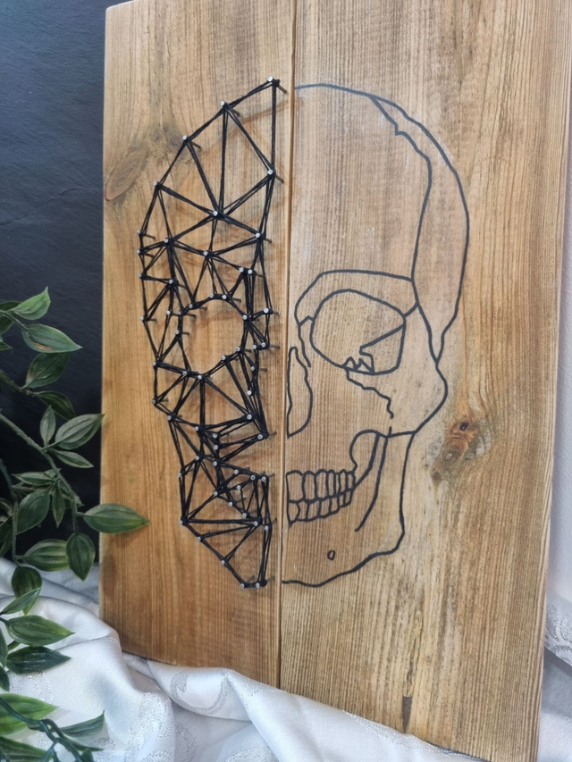 Cette Œuvre d’Art Audacieuse est un tableau String Art réalisé à partir de fil noir tendu sur une planche de bois rectangulaire de récupération. Le fil forme un motif géométrique qui crée la silhouette d’une tête de mort. Le style est minimaliste et contrasté, mais aussi rebelle et rock. Il peut être accroché au mur grâce à un crochet ou tout simplement posé sur un meuble.
