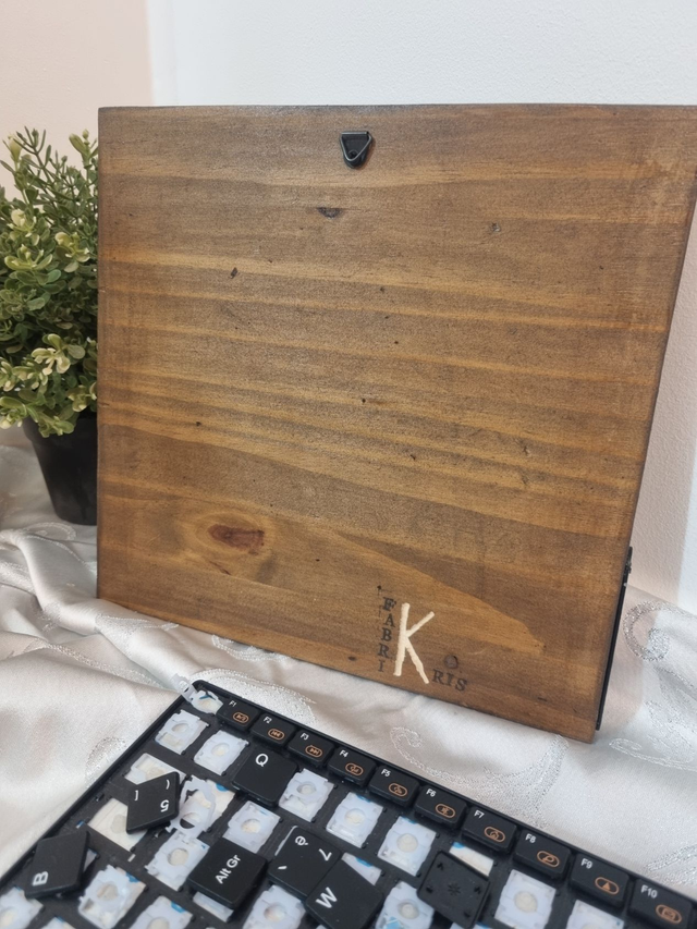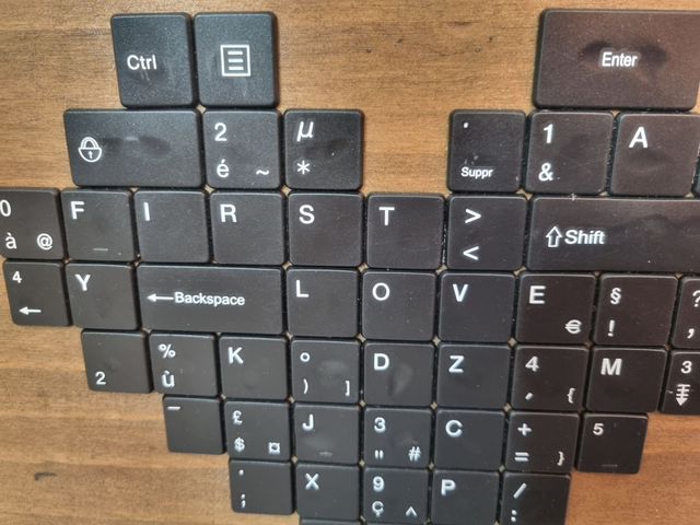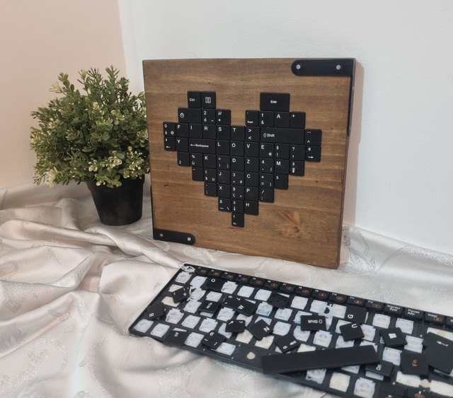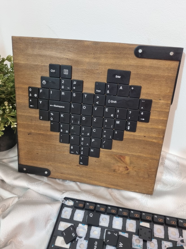 Cette Œuvre d’Art Upcycling est un tableau réalisé à partir de touches de clavier recyclées, qui sont collées sur un support en bois. Les touches de clavier forment un joli cœur géométrique noir, qui contraste avec le fond en bois. Si on s’approche un peu, on peut voir les mots “FIRST LOVE”. Ce tableau est une façon créative et ludique de donner une seconde vie à des objets du quotidien. Il peut être accroché au mur ou posé sur un meuble. Ce tableau est idéal pour décorer votre maison dans un style moderne et décalé.