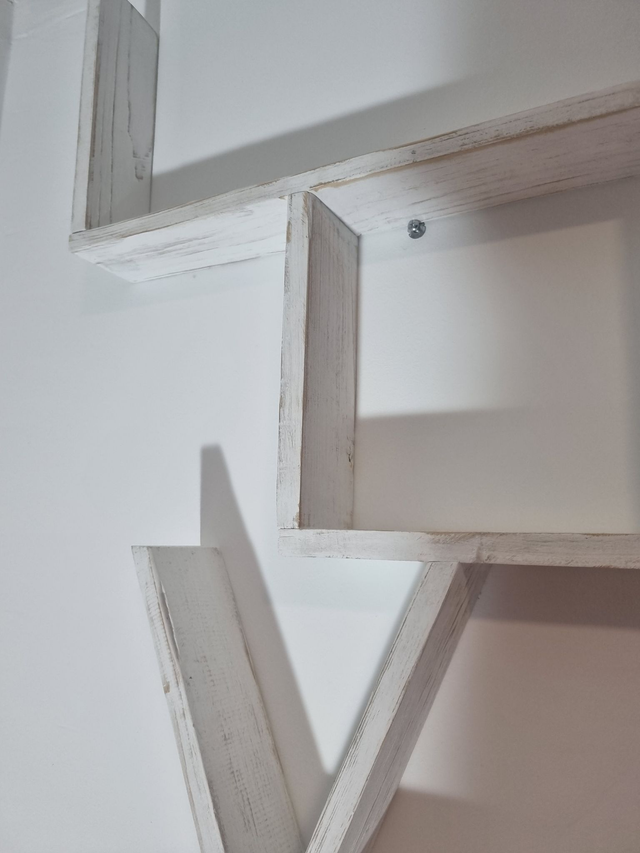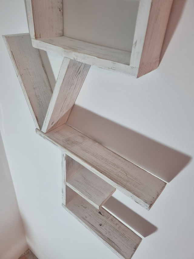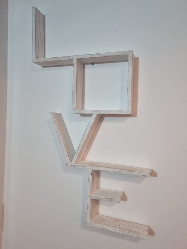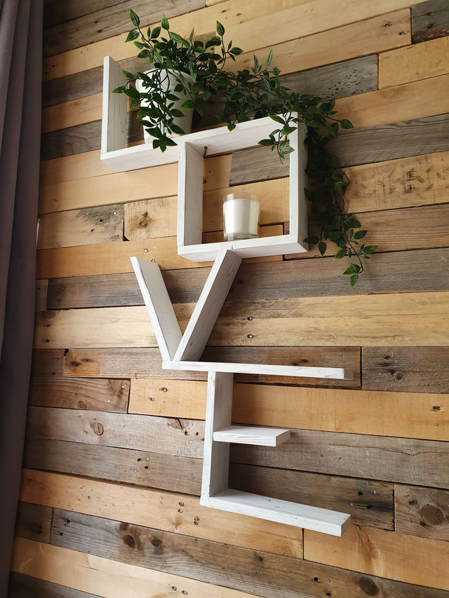 Cette Étagère Murale Upcycling en bois blanc est un objet décoratif et fonctionnel pour votre intérieur. Elle est composée de planches de palette de différentes tailles disposées dans un design abstrait et moderne formant le mot “LOVE”. Elle est idéale pour exposer vos petites plantes, vos livres ou vos objets déco. Elle possède deux accroches pour pouvoir la fixer au mur, dont deux de plus fournies. Elle apportera une touche d’originalité et de style à votre pièce.
