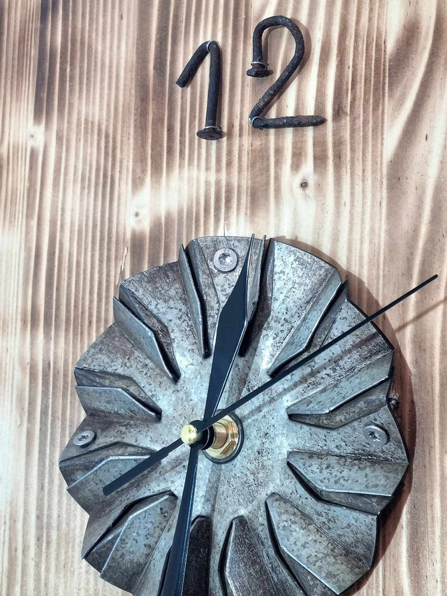 Cette Horloge Murale Upcycling est fabriquée à partir d’une lame de ventilateur en métal recyclé. Elle a un aspect vintage, industriel et rustique qui apportera du caractère à votre intérieur. Les chiffres sont faits de clous rouillés tordus et les aiguilles sont noires. L’horloge est montée sur une planche de bois avec le chiffre “12” et “6”. Chaque création de ma boutique est unique et faite à la main. C’est une idée de cadeau originale et écologique pour les amateurs de décoration rétro.