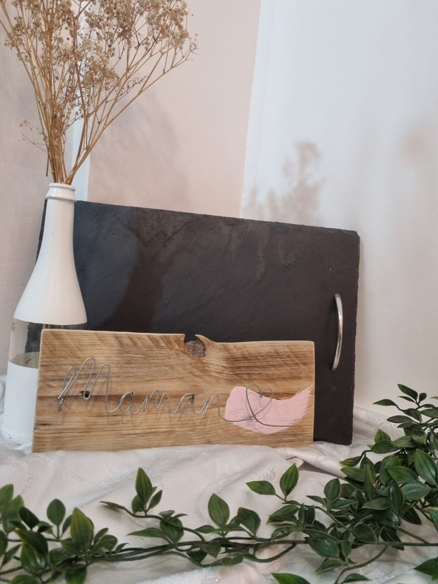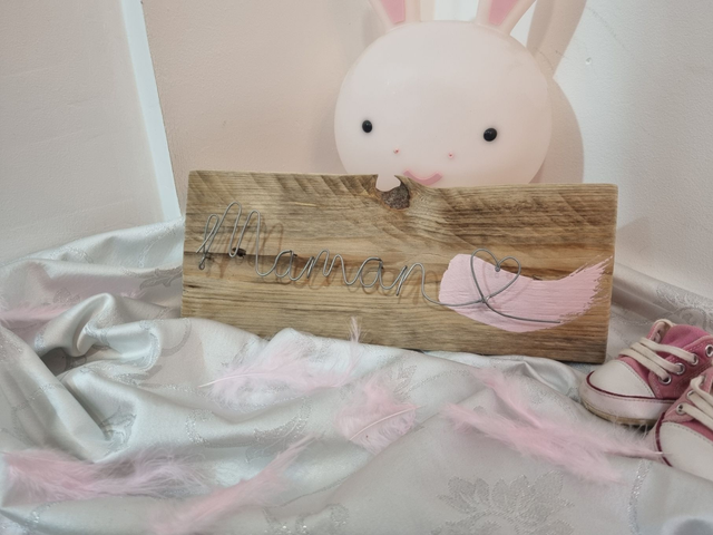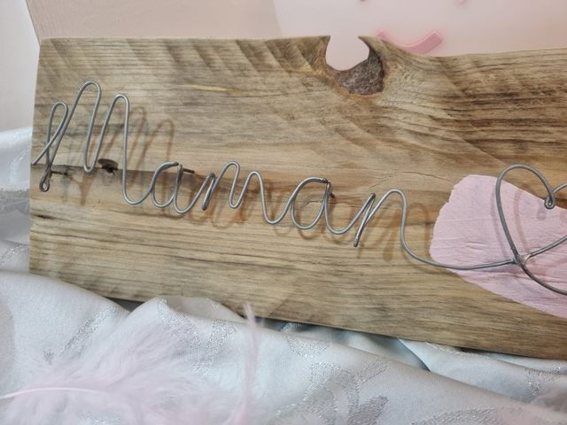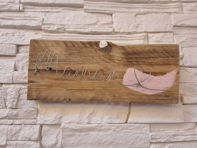 Cette Œuvre d’Art Originale est un tableau ‘One Drawing’ réalisé à partir de fil de fer tendu sur une planche de palette de bois rectangulaire. Le fil forme un mot en écriture cursive : “maman”. Le style est simple et élégant, mais aussi affectueux et sentimental. Il peut être accroché au mur grâce à un crochet. Ce tableau est idéal pour offrir à sa maman ou pour décorer une chambre d’enfant dans un style cosy et naturel.